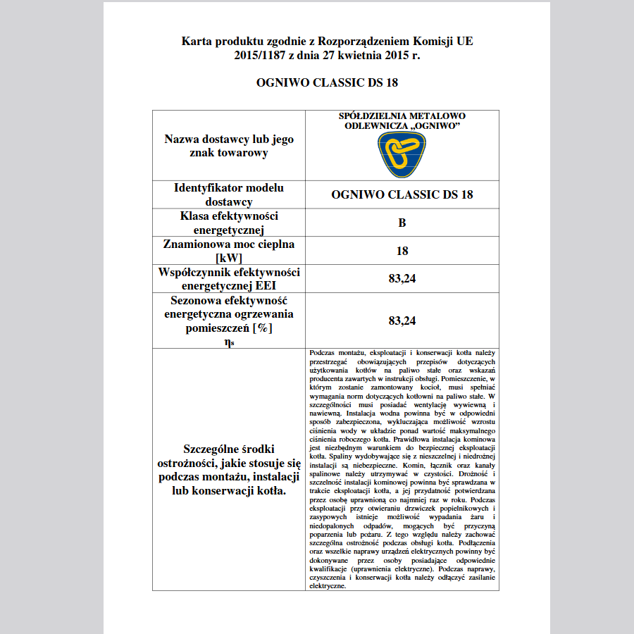 Kocioł grzewczy OGNIWO CLASSIC DS to urządzenie spełniające wymagania normy PN-EN 303-5:2021-09 dla 5 klasy, dyrektywy ekoprojektu, oraz programów ochrony środowiska.