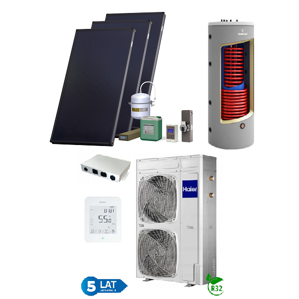 PAKIET SOLARNY HEWALEX Z POMPĄ CIEPŁA HAIER 11KW (HAIER 11kW monoblok; zbiornik C.O/C.W.U GALMET KUMULO 500/200 2W 2,1/2,2m2; zestaw solarny HX00-3KS2100)