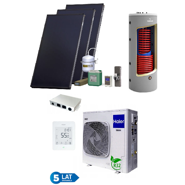 PAKIET SOLARNY HEWALEX Z POMPĄ CIEPŁA HAIER 5KW (HAIER 5kW monoblok; zbiornik C.O/C.W.U GALMET KUMULO 500/160 2W 2,1/1m2; zestaw solarny HX00-3KS2100)