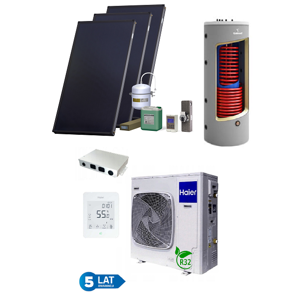 PAKIET SOLARNY HEWALEX Z POMPĄ CIEPŁA HAIER 5KW (HAIER 5kW monoblok; zbiornik C.O/C.W.U GALMET KUMULO 500/200 2W 2,1/2,2m2; zestaw solarny HX00-3KS2100)