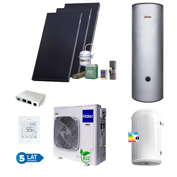 PAKIET SOLARNY HEWALEX Z POMPĄ CIEPŁA HAIER 8KW (HAIER 8kW monoblok; zbiornik C.W.U nierdzewny TERMICA 250 l 2W 1,7/1,7 m2; bufor 120 l; zestaw solarny HX00-3KS2100)
