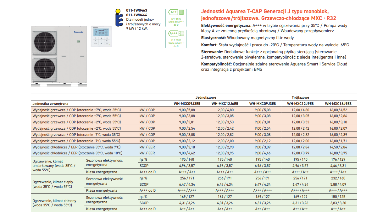 PANASONIC AQUAREA T-CAP NISKOTEMP. 1-FZ POMPA CIEPŁA 9/9 KW TYPU MONOBLOK DO GRZANIA I CHŁODZENIA WH-MXC09J3E5