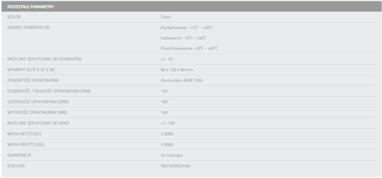 TechnologiaAGM(Absorbent Glass Mat), w jakiej projektowane są nasze akumulatory oznacza, że elektrolit zawarty w akumulatorze jest wchłonięty przez specjalne maty z składające się z włókna szklanego o wysokiej porowatości umieszczonych pomiędzy ołowianymi płytkami.Rozwiązanie to pozwala na dłuższą pracę baterii, dzięki procesowi powolnego rozładowywania.