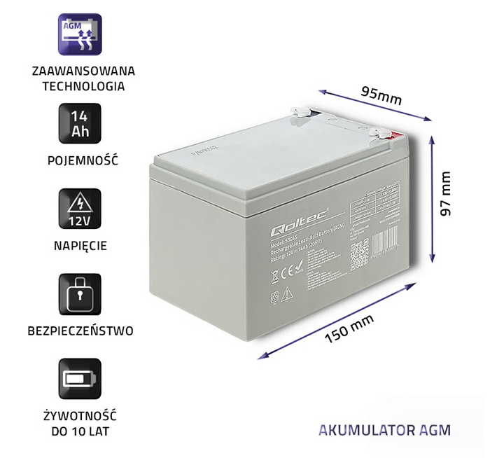 QOLTEC AKUMULATOR AGM 14 Ah 12V 53045