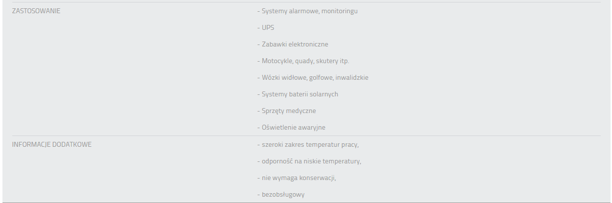 Wykorzystywana bateria będzie bardzo sprawnie funkcjonowała i cieszyła się długą żywotnością – wynoszącąnawet 10 lat, jako zasilanie awaryjne w pracy buforowejnp.do zasilaczy UPS, w systemach alarmowych, oświetleniu awaryjnym czy pojazdach spalinowych.