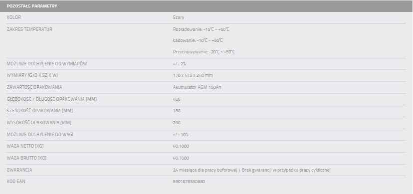 TechnologiaAGM(Absorbent Glass Mat), w jakiej projektowane są nasze akumulatory oznacza, że elektrolit zawarty w akumulatorze jest wchłonięty przez specjalne maty z składające się z włókna szklanego o wysokiej porowatości umieszczonych pomiędzy ołowianymi płytkami.Rozwiązanie to pozwala na dłuższą pracę baterii, dzięki procesowi powolnego rozładowywania.