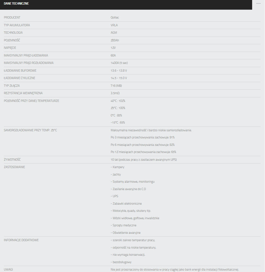 Wykorzystywana bateria będzie bardzo sprawnie funkcjonowała i cieszyła się długą żywotnością – wynoszącąnawet 10 lat, jako zasilanie awaryjne w pracy buforowejnp.do zasilaczy UPS, w systemach alarmowych, oświetleniu awaryjnym czy pojazdach spalinowych.