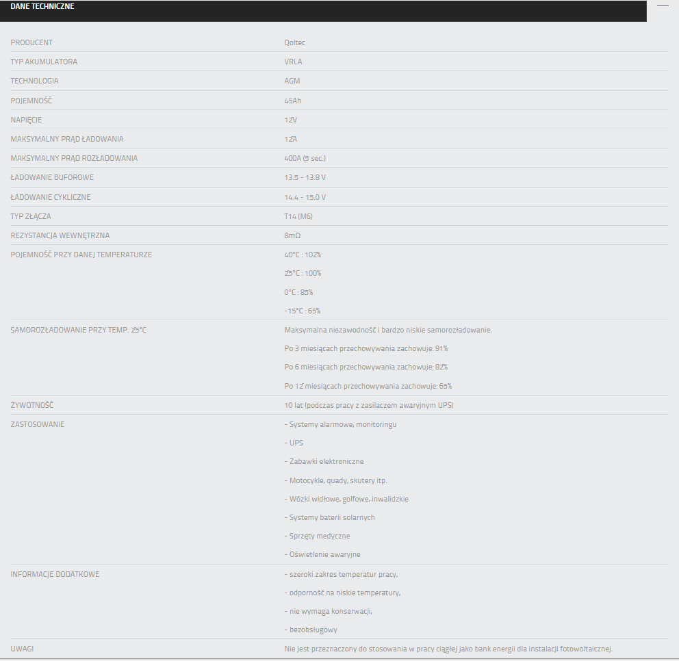 Wykorzystywana bateria będzie bardzo sprawnie funkcjonowała i cieszyła się długą żywotnością – wynoszącąnawet 10 lat, jako zasilanie awaryjne w pracy buforowejnp.do zasilaczy UPS, w systemach alarmowych, oświetleniu awaryjnym czy pojazdach spalinowych.