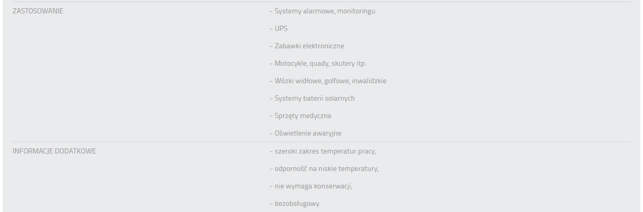 Wykorzystywana bateria będzie bardzo sprawnie funkcjonowała i cieszyła się długą żywotnością – wynoszącąnawet 10 lat, jako zasilanie awaryjne w pracy buforowejnp.do zasilaczy UPS, w systemach alarmowych, oświetleniu awaryjnym czy pojazdach spalinowych.