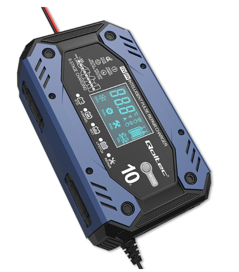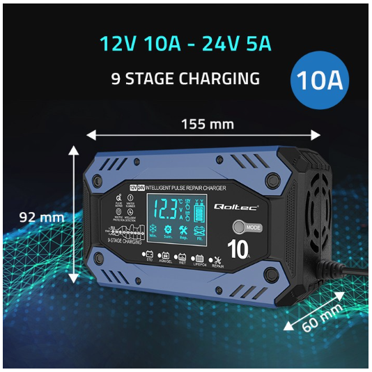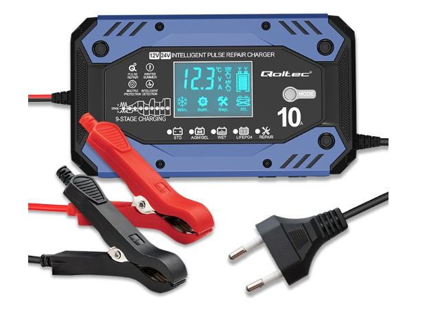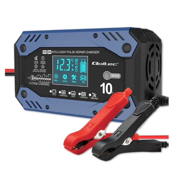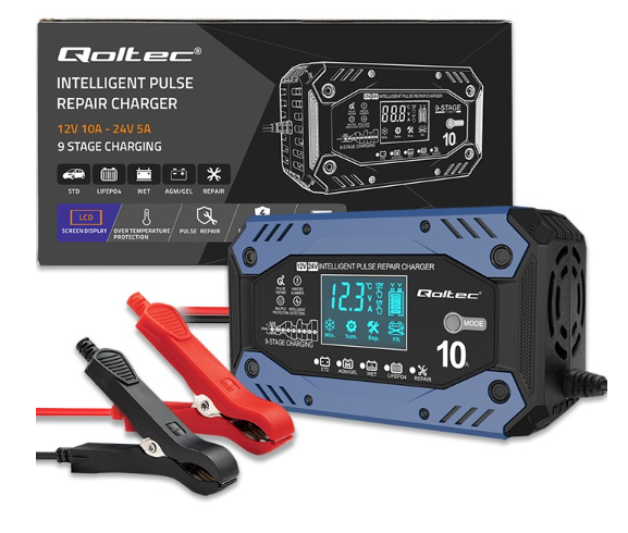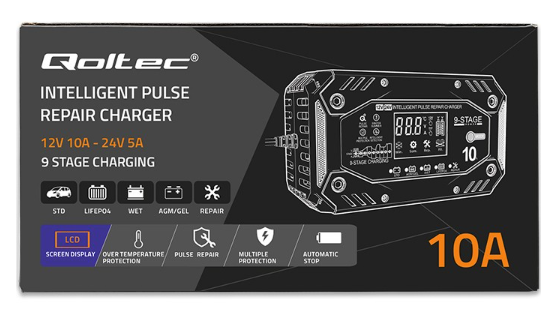 QOLTEC MIKROPROCESOROWA ŁADOWARKA PROSTOWNIK 12 – 24V 10A 52482 (do akumulatora STD; AGM; GEL; LiFePO4 z funkcją naprawy)