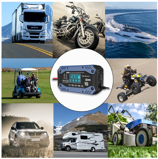 Nasza ładowarka pasuje do wszystkich akumulatorów typu AGM, LIfePO4, GEL, WET i STD. Może być stosowany do akumulatorów w samochodach, motocyklach, jachtach, kosiarkach, pojazdach rolniczych i quadach.