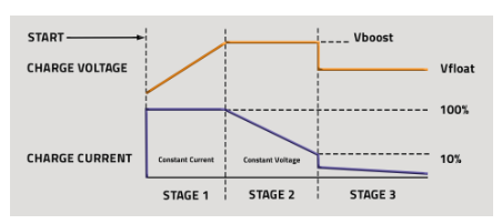 EtapFLOATto tak zwane podtrzymanie w którymakumulator osiągnął już 95% pojemności i stopniowo osiąga 100%, następuje zmniejszenie napięcia ładowania do stałej wartości pomiędzy 13.0VDC a 13.8 VDC.