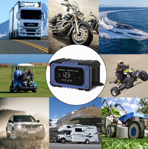 Czas potrzebny do naładowania zależy od stopnia rozładowania akumulatora i jego rzeczywistej pojemności. Ładowarka przeznaczona do ładowania akumulatorów w samochodach, motocyklach, łodziach, kosiarkach, pojazdach rolniczych i quadach.