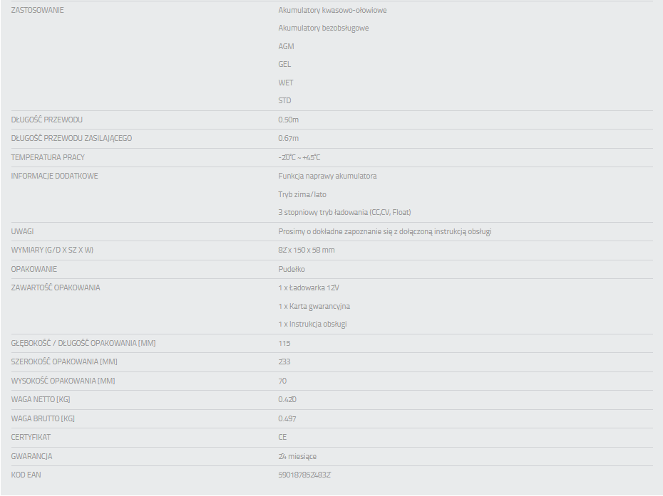 –Tryb samochodowydo akumulatorów GEL, SLA, WET, DEEP CYCLE, EFB i wapniowych,