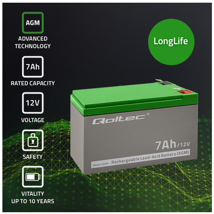 TechnologiaAGM(Absorbent Glass Mat), w jakiej projektowane są nasze akumulatory oznacza, że elektrolit zawarty w akumulatorze jest wchłonięty przez specjalne maty z składające się z włókna szklanego o wysokiej porowatości umieszczonych pomiędzy ołowianymi płytkami.Rozwiązanie to pozwala na dłuższą pracę baterii, dzięki procesowi powolnego rozładowywania.