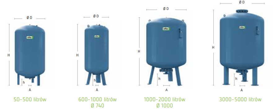 - 2-25 l: wykonanie wiszące; 33 l: z uchwytami mocującymi lub stojące; od 50 l – stojące; od Ø 1000 mm w zestawie z manometrem