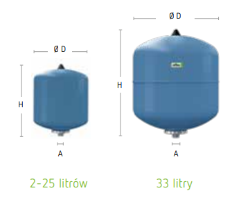 - 2-25 l: wykonanie wiszące; 33 l: z uchwytami mocującymi lub stojące; od 50 l – stojące; od Ø 1000 mm w zestawie z manometrem