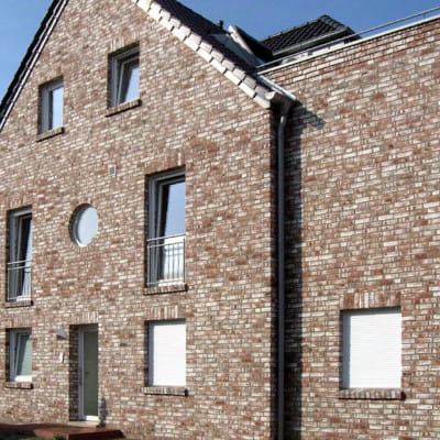 Płytka licowa ręcznie formowana najwyższej jakości – RöbenPREMIUM. Wyróżniają ją białe smugi na czerwonym tle, przypominające pociągnięcia białą farbą po ceglanym płótnie.