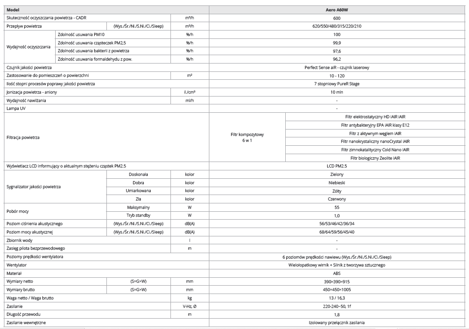 | Wydajność w oczyszczaniu powietrza z pyłu, kurzu i dymu - CADR (m3/h) | 600 |