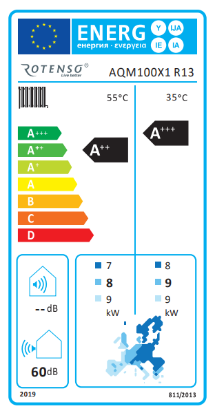 Poziom efektywności energetycznej pomp ciepła Rotenso®AquamiwynosiA+++(dla temp. wody 35°C)iA++(dla temp. wody 55°C).