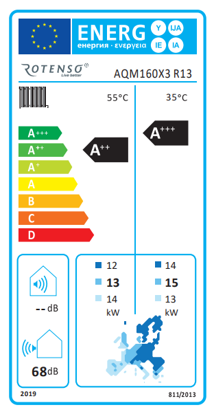 Poziom efektywności energetycznej pomp ciepła Rotenso®AquamiwynosiA+++(dla temp. wody 35°C)iA++(dla temp. wody 55°C).