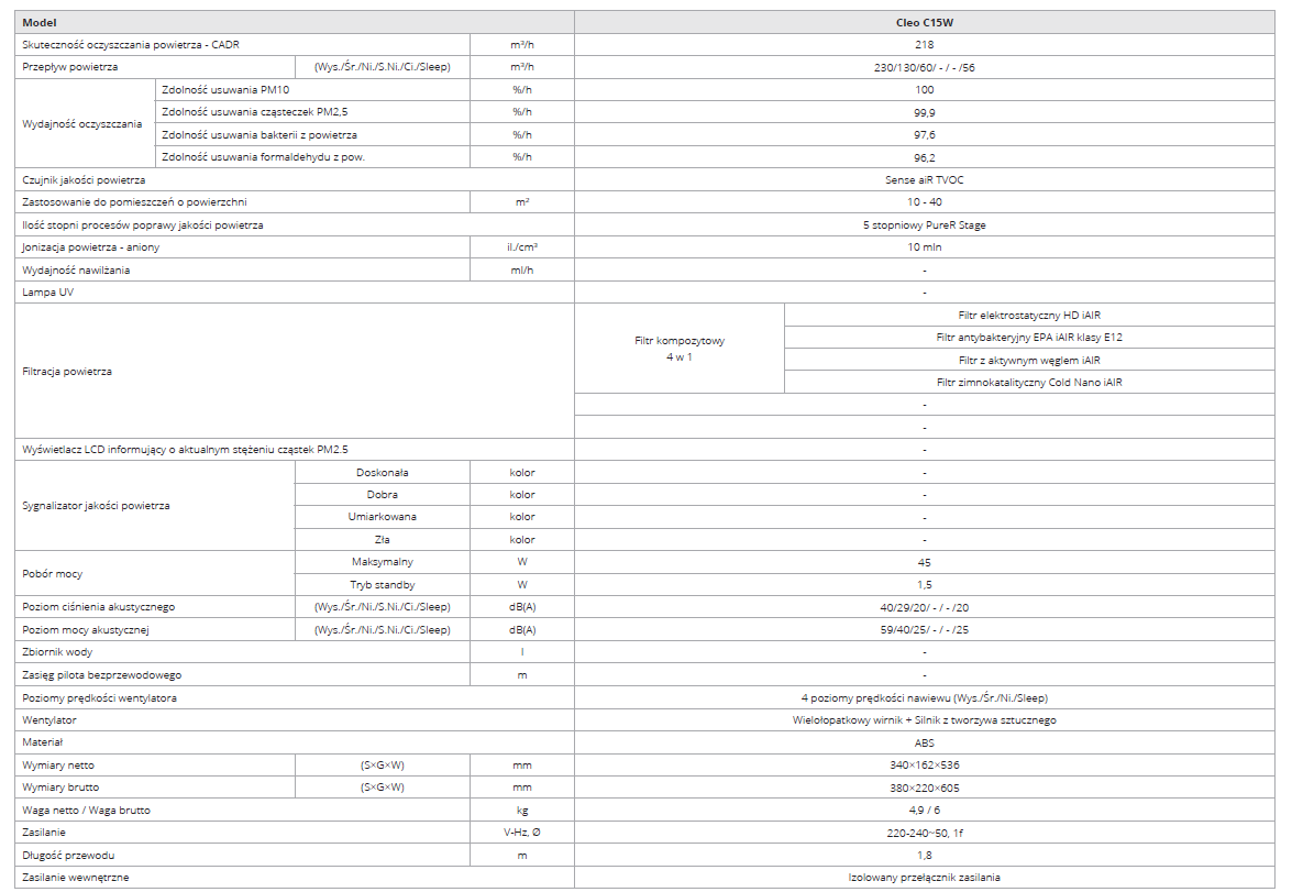 ROTENSO CLEO C15W OCZYSZCZACZ POWIETRZA 218 M3/H; 40 M2 Z 4-STOPNIOWYM FILTREM KOMPOZYTOWYM ORAZ JONIZATOREM
