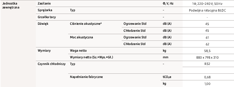 | Gwarancja (lata) | 3 lata na urządzenia, 5 lat na sprężarki. Samsung zapewnia części zamienne, robocizna po stronie instalatora |