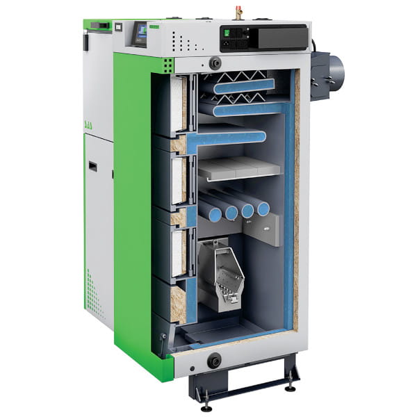 Wyposażenie:sterownik (ST-555P), palnik SAS MULTI FLAME (moduł sterujący praca palnika, grzałka do rozpalania, mechanizm ruszt ruchomych, fotokomórka – czujnik ognia, czujnik temp. podajnika), wentylator (system kontroli przepływu powietrza – AIR FLOW CONTROL), panele ceramiczne, termometr, szuflada popielnicowa, zawór bezpieczeństwa, zasobnik paliwa z czujnikiem otwarcia klapy, czujnik temperatury spalin, komplet stopek regulacyjnych (nie dotyczy kotłów o mocy powyżej 36 kW), komplet narzędzi do obsługi kotła
