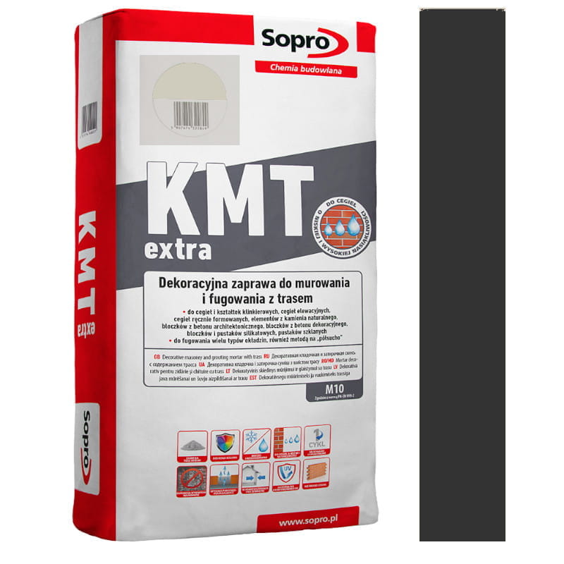 Dekoracyjna zaprawa z trasem Sopro KMT extra jest suchą zaprawą, która po wymieszaniu z wodą staje się gotowa do użycia. Jest łatwa i szybka w przygotowaniu, charakteryzuje się optymalną przyczepnością do cegły.