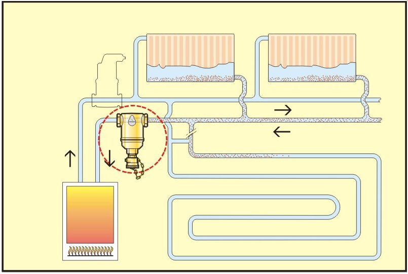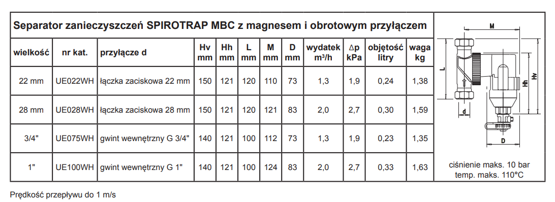 Separator zanieczyszczeń SPIROTRAP MBC służy do usuwania wszelkich zanieczyszczeń stałych z instalacji cieczowych grzewczych/chłodniczych, w których ma miejsce ciągła cyrkulacja czynnika. Dzięki swojej konstrukcji, separator SPIROTRAP MBC jest w stanie wyłapywać zanieczyszczenia wielkości od 5 mikrometrów wzwyż, przy małych oporach przepływu i braku możliwości zablokowania urządzenia (zanieczyszczenia gromadzą się w komorze kolekcyjnej, poza strugą płynącej wody). Dodatkowo SPIROTAP MBC wyposażony jest w zewnętrzny magnes, który skutecznie wspomaga wyłapywanie cząsteczek magnetytu, będącego dużym zagrożeniem dla pomp i innych, drogich armatur w instalacji. Usuwanie zanieczyszczeń odbywa się w sposób ciągły, bez przerywania pracy systemu. Centralna separacja zanieczyszczeń pozwala ograniczyć ilość obejść filtrów, filtrów wymiennych i zaworów odcinających. Wszystko to zapewnia wyciszenie pracy instalacji, przedłużenie żywotności jej elementów i redukcję kosztów obsługi układu grzewczego/chłodniczego. SPIROTRAP MBC wyposażony jest w obrotową flanszę przyłączeniową, która umożliwia montaż separatora na dowolnie przebiegających rurociągach – poziomych, pionowych i ukośnych. Dobór urządzenia ze względu na przepływ w miejscu montażu separatora.