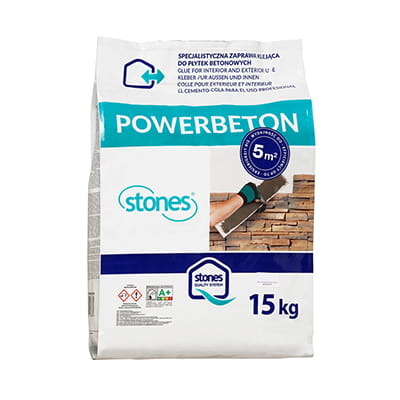 Zaprawa klejąca POWERBETON jest fabrycznie przygotowaną suchą mieszanką spoiwa mineralnego i organicznego, wypełniaczy mineralnych oraz domieszek modyfikujących. Po zarobieniu wodą tworzy jednorodną masę klejącą do nakładania cienkowarstwowego. Zapewnia szybkie uzyskanie dużej przyczepności i wytrzymałości wstępnej. Po stwardnieniu wodo- i mrozoodporna. Zaprawa przeznaczona jest do przyklejania płytek betonowych STONES, płytek ceramicznych ściennych i podłogowych (glazury i terakoty), wewnątrz i na zewnątrz pomieszczeń. Podłożami mogą być: betony zwykłe, betony na kruszywie lekkim, betony komórkowe, tynki cementowe i cementowo-wapienne, nośne tynki wapienne, tynki gipsowe, płyty gipsowo-kartonowe i gipsowo-włóknowe.