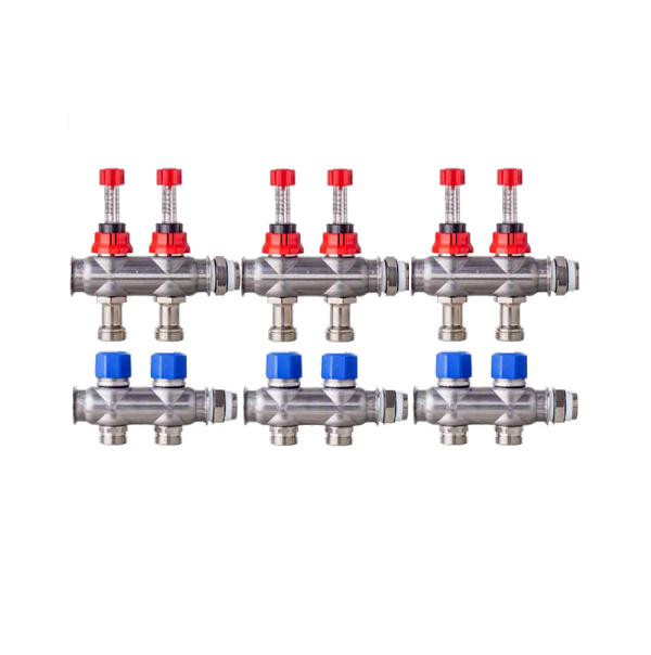 - na belce powrotnej: zintegrowane wkładki termostatyczne; materiał: stal nierdzewna z gwintem M30x1,5 z ręcznymi nakrętkami wkolorze niebieskim,