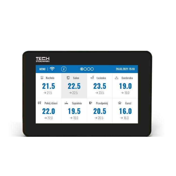 Czytelny, dotykowy panel umożliwia łatwe zarządzanie pracą podrzędnych urządzeń. Aby dokonać ustawień w podrzędnej sterownikowi strefie, wystarczy kliknąć obszar ekranu z informacją o jego stanie. Wygląd wyświetlacza panelu kontrolnego sterowników ogrzewania można dopasować do swoich potrzeb, korzystając z funkcji ustawienia ekranu. Można m.in. ustawić wygaszacz ekranu w postaci zegara albo daty. Dodatkowo użytkownik ma możliwość wyboru wersji kolorystycznej ekranu sterownika oraz włączenia lub wyłączenia dźwięku.