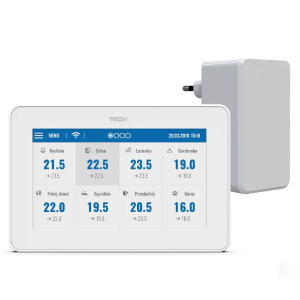 Panel M-9T jest urządzeniem nadrzędnym. Pozwala wygodnie kontrolować i edytować parametry pracy ogrzewania maksymalnie aż w 32 strefach. Z pomocąpanelu kontrolnego sterowników ogrzewaniamożna wygodnie definiować harmonogramy pracy, a także osobno ustalać wartość temperatury zadanej. Dodatkowo z poziomu panelu można włączać i wyłączać poszczególne strefy. Na wyświetlaczu panelu można również skorzystać z opcji dodatkowych jak ustawienie daty oraz godziny, wygaszacza ekranu, budzika, zaprogramować blokadę ekranu.
