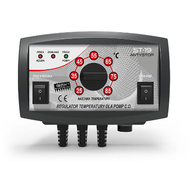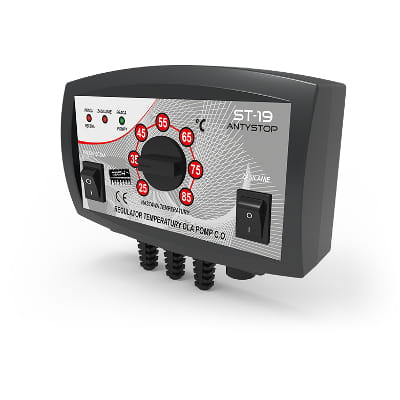 Regulator ST-19antystopprzeznaczony jest do sterowania pompą obiegu wody centralnego ogrzewania. Ustawianie temperatury zadanej dokonujemy za pomocą potencjometru. Zadaniem regulatora jest: załączanie pompy, jeśli temperatura uzyska zadaną wartość, oraz wyłączanie jej – jeśli piec wychłodzi się o 2°C poniżej zadanej.