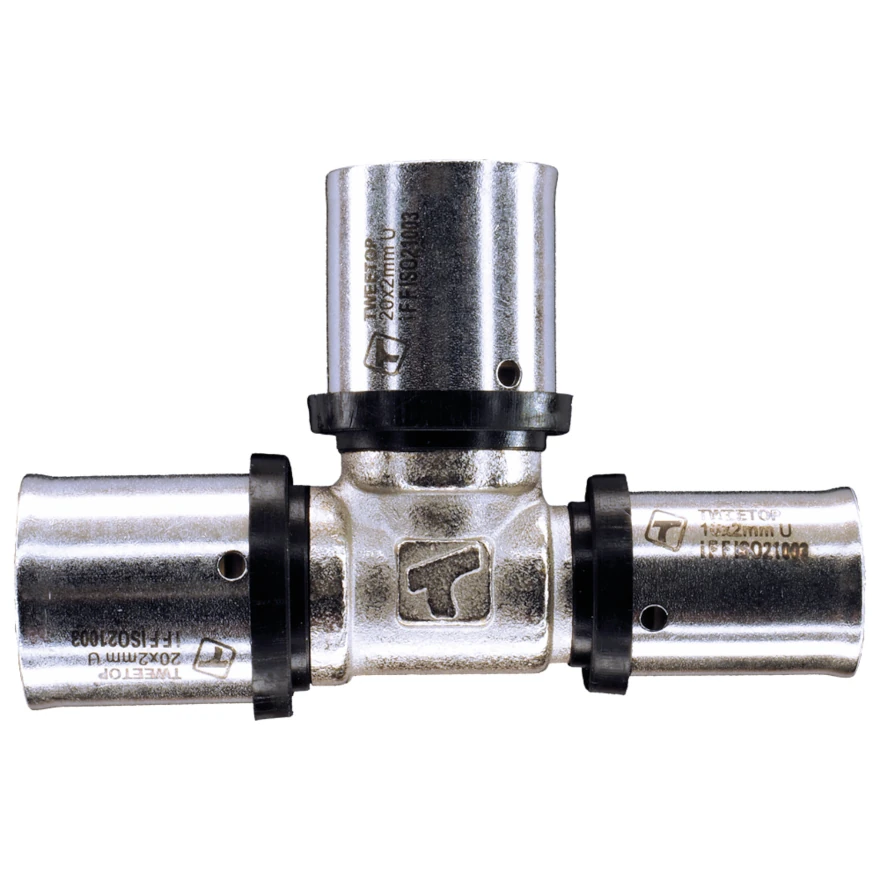 Podstawowym sposobem łączenia rur TweeTop jest użycie złączek zaprasowywanych. Kształtki tego typu są dostępne w średnicach 14-75mm. Połączenie rury z kształtką uzyskujemy, wgniatając (wprasowując) rurę w profil kształtki , w strefie złącza, za pomocą zaciskarki wyposażonej w szczęki typu U, dostosowane do typu kształtki. Szczelność komory połączeniowej gwarantują dwie uszczelki oringowe idealnie wkomponowane w strefę złącza. Dostępne średnice 14-75mm.
