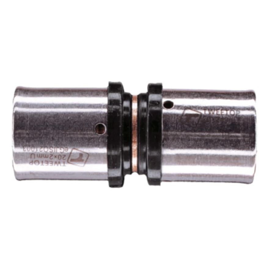 Podstawowym sposobem łączenia rur TweeTop jest użycie złączek zaprasowywanych. Kształtki tego typu są dostępne w średnicach 14-75mm. Połączenie rury z kształtką uzyskujemy, wgniatając (wprasowując) rurę w profil kształtki , w strefie złącza, za pomocą zaciskarki wyposażonej w szczęki typu U, dostosowane do typu kształtki. Szczelność komory połączeniowej gwarantują dwie uszczelki oringowe idealnie wkomponowane w strefę złącza. Dostępne średnice 14-75mm.