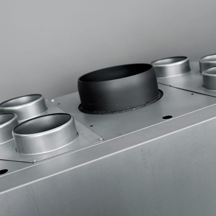Wkład Unifam Evo przystosowany jest do domów energooszczędnych, wyposażonych w wentylację z odzyskiem ciepła. Blaszany dystrybutor gorącego powietrza ułatwia przyłączenie wkładu do systemu kanałów rozprowadzających ciepłe powietrze. Wkład pozwala na sprawne i oszczędne ogrzewanie domu.