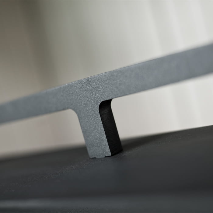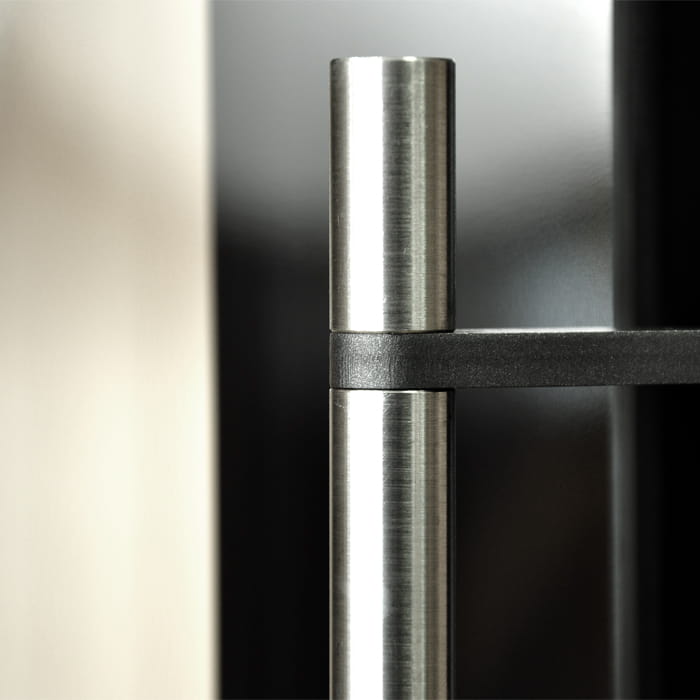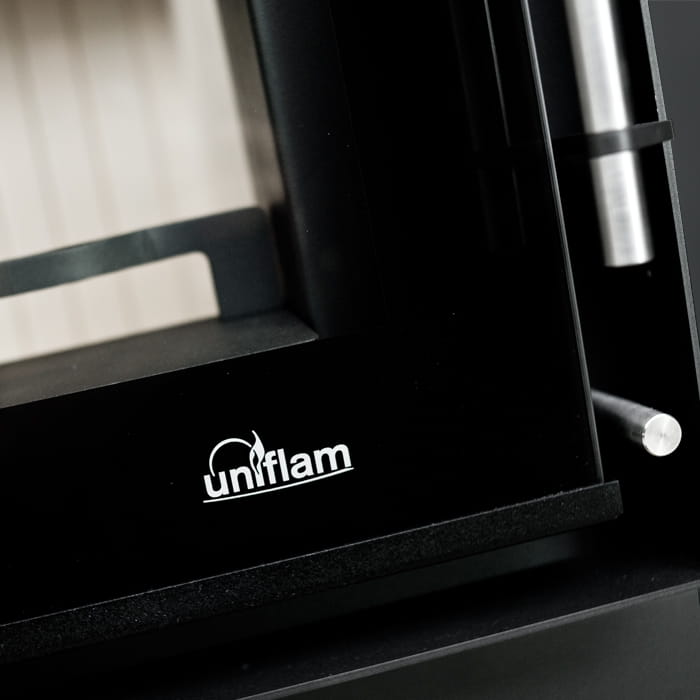 Nowoczesna, stalowa fasada oraz duża szyba z czarnym zdobieniem zapewniają idealną wizję ognia. Klamka oraz uchwyt regulacji powietrza wykonane ze stali nierdzewnej uzupełniają całość tworząc nowoczesną stylistykę paleniska Uniflam Evo.