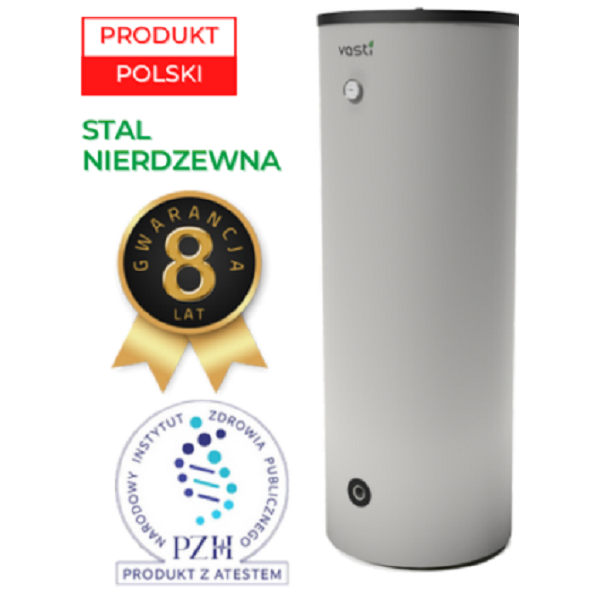 Zasobniki ciepłej wody użytkowej marki Vasti z jedną wężownicą,to pionowe, stojące zasobniki, wykonane ze stali nierdzewnej, dzięki czemu zachowują długą żywotność i nie wymagają zastosowania anody. Wydajna wężownica inox o dużej powierzchni, w którą został wyposażony nasz wymiennik, umożliwia szybsze nagrzewanie wody i przez to ma wyższą sprawność. Zastosowanie bocznych, znormalizowanych króćców przyłączeniowych znacznie upraszcza montaż wymiennika. Wykorzystanie izolacji zbiornika o niskim współczynniku przenikania ciepła zapewnia minimalne straty i większą efektywność działania.