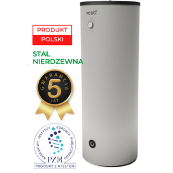 Zasobniki ciepłej wody użytkowej marki Vasti z jedną wężownicą,to pionowe, stojące zasobniki, wykonane ze stali nierdzewnej, dzięki czemu zachowują długą żywotność i nie wymagają zastosowania anody. Wydajna wężownica inox o dużej powierzchni, w którą został wyposażony nasz wymiennik, umożliwia szybsze nagrzewanie wody i przez to ma wyższą sprawność. Zastosowanie bocznych, znormalizowanych króćców przyłączeniowych znacznie upraszcza montaż wymiennika. Wykorzystanie izolacji zbiornika o niskim współczynniku przenikania ciepła zapewnia minimalne straty i większą efektywność działania.