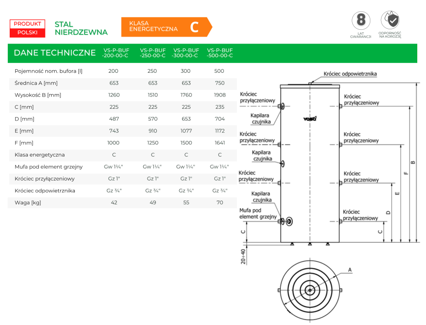 Oferujemy bufory wykonane ze stali nierdzewnej w klasie energetycznej B (pojemności 120 l i 150 l) oraz bufory w klasie energetycznej C o pojemności 200 l, 250 l oraz 300 l.