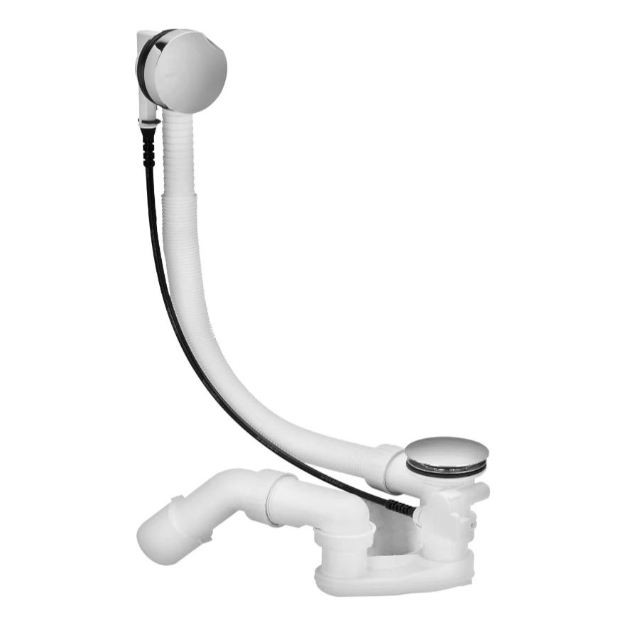 Rura przelewowa elastyczna, pokrętło chromowane, korek dozaworu chromowany, syfon, łuk odpływowy45°, zawór zestali nierdzewnej
