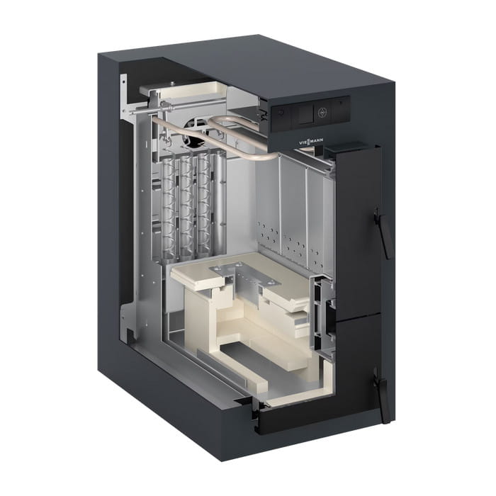 Powierzchnie grzewcze można łatwo czyścić z boku za pomocą dźwigni. Dzięki technologii zgazowania i kontroli spalania z sondą Lambda, Vitoligno 150-S osiąga wysoką sprawność i czyste, wydajne spalanie przy bardzo niskim poziomie zapylenia. Możliwość zawiasu drzwi z obu stron zapewnia optymalne wykorzystanie przestrzeni i umożliwia narożne ustawienie w pomieszczeniu instalacyjnym.