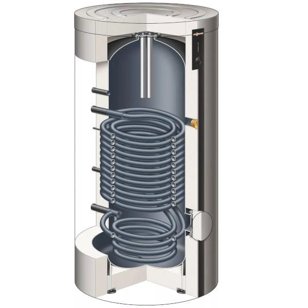 - Wysoki komfort korzystania z ciepłej wody użytkowej dzięki szybkiemu, równomiernemu podgrzewowi za pomocą wężownicy grzewczej o dużej powierzchni wymiany ciepła.