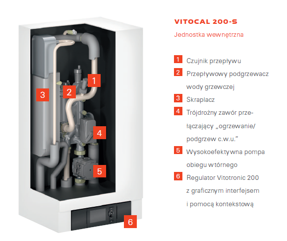 - Pompa ciepła powietrze–woda Vitocal 200-S typu Split, o maksymalnej mocy grzewczej 5,7do 14,7 kW (przy A7/W35)