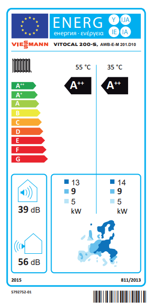 - Pompa ciepła powietrze–woda Vitocal 200-S typu Split, o maksymalnej mocy grzewczej 5,7do 14,7 kW (przy A7/W35)