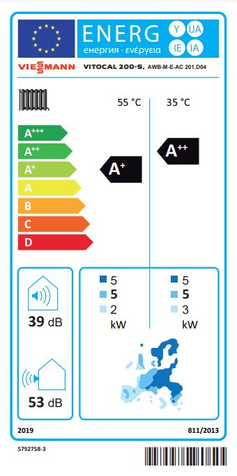 - Pompa ciepła powietrze–woda Vitocal 200-S typu Split, o maksymalnej mocy grzewczej 5,7do 14,7 kW (przy A7/W35)