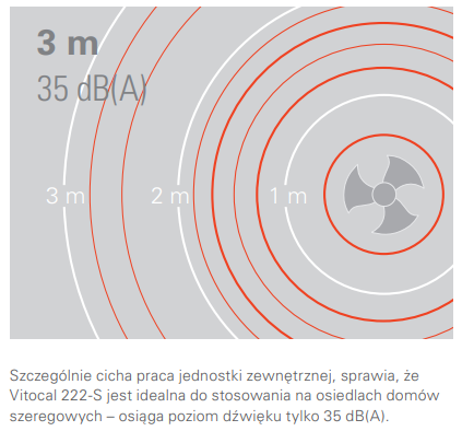 Nowe jednostki zewnętrzne charakteryzują się ponadczasowym wzornictwem. Zostały one zaprojektowane i wyprodukowane przez firmę Viessmann z największą dbałością o detale oraz z wykorzystaniem najnowszych rozwiązań z dziedziny akustyki. Dzięki temu pompy Vitocal 222-S nadają się szczególnie do stosowania wgęsto zabudowanych obszarach, takich jak osiedla ozabudowie szeregowej zapewniając bardzo cichą ikomfortową pracę.
