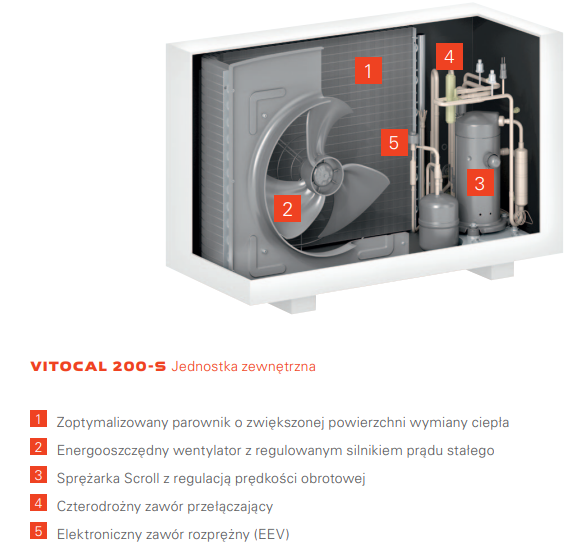 Kompaktowe gabaryty jednostek wewnętrznych pozwalają umieścić je bez trudu w piwnicy czy pomieszczeniu gospodarczym każdego domu. Jednostka wewnętrzna jest już wyposażona fabrycznie we wszystkie niezbędne elementy. Modele Vitocal 111-S, 222-S posiadają także zintegrowany pojemnościowy podgrzewacz c.w.u. o pojemności 220 litrów. Jednostki zewnętrzne można zawiesić na ścianie zewnętrznej budynku, z wykorzystaniem przewidzianego dla nich osprzętu montażowego lub zamontować wolnostojąco na posesji.
